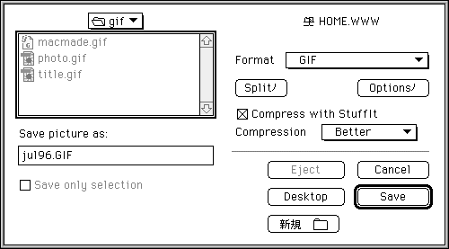 ホームページで画像を表示させるためには、画像のファイル形式をGIF形式にしなければならない(ネットスケープナビゲーターではJPEG形式にも対応)。GraphicConverterはウィンドウズの標準画像形式であるBMPやマッキントッシュの標準画像形式であるPICTを、GIFやJPEGに変換できるソフトだ。