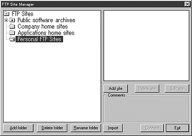 - 3.[画面1]「FTP Site Manager」というウィンドウが現れるので「Personal FTP Sites」というフォルダーをクリックして開く。
