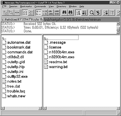 - 9.ダウンロードが完了すると、ウィンドウ上部に「Successfully」と表示される。CuteFTPを閉じて接続を切る。ダウンロードしたファイルをダブルクリックするとネットスケープナビゲーターのセットアップが始まる。