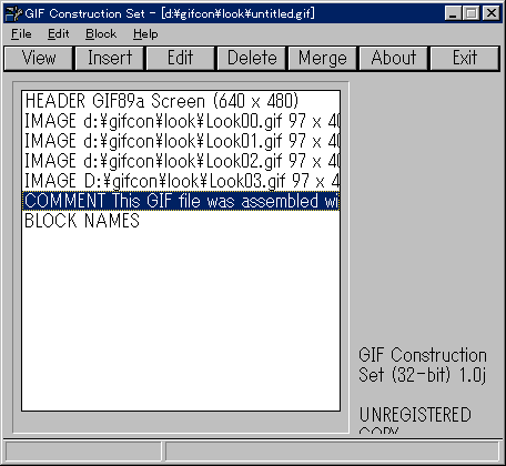 - GIF Construction Setのアイコンをダブルクリックして立ち上げると、図2のようなウィンドウが表示される。このウィンドウのリストに、あらかじめ用意したグラフィックファイルを、表示する順番に加えていく。