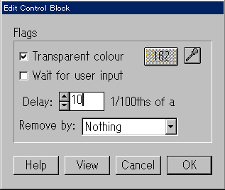 - また、このControl Blockのウィンドウでは、透明化の設定もできる。「Transparent colour」にチェックをして、透明にしたい色を右のボタンで選ぶ。2つボタンがあるが、左のボタンでは色のパレットから選ぶことになり、右では実際の画像を表示して、その部分をクリックして選ぶことになる。